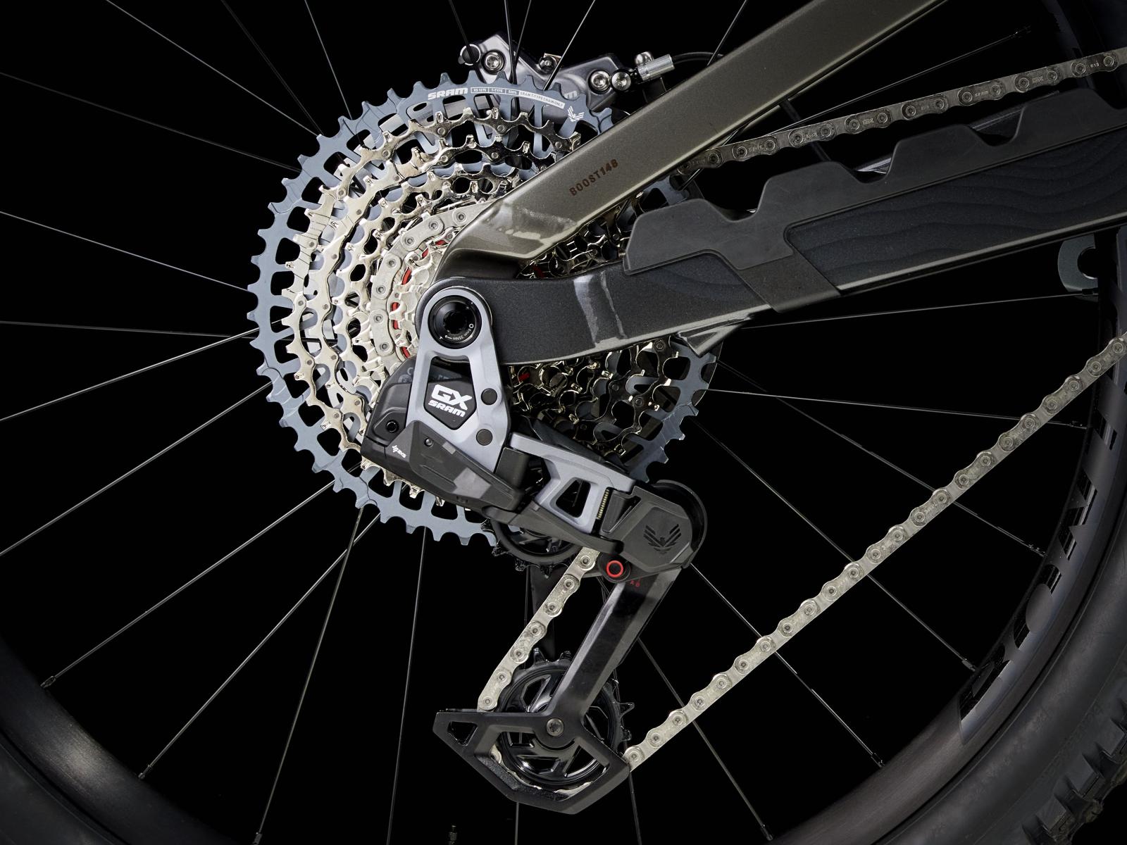Einen Rahmen aus Alpha Platinum Aluminium mit High-Pivot-Fahrwerk und Umlenkrolle sowie ein Rahmenstaufach. Eine RockShox ZEB Select+ Gabel mit 170 mm Federweg, DebonAir Federung und Charger 3 RC2 Dämpfung und einen RockShox Vivid Select+ Hinterbaudämpfer mit ebenfalls 170 mm Hub. Außerdem die drahtlose SRAM GX AXS Transmission mit breiter Übersetzung für knackige Anstiege, eine Bontrager Line Variosattelstütze und eine Mullet-Konfiguration (29" vorn, 27,5" hinten) mit Bontrager Line Comp 30 Tubeless-Ready-Laufrädern samt Rapid Drive Nabe.
